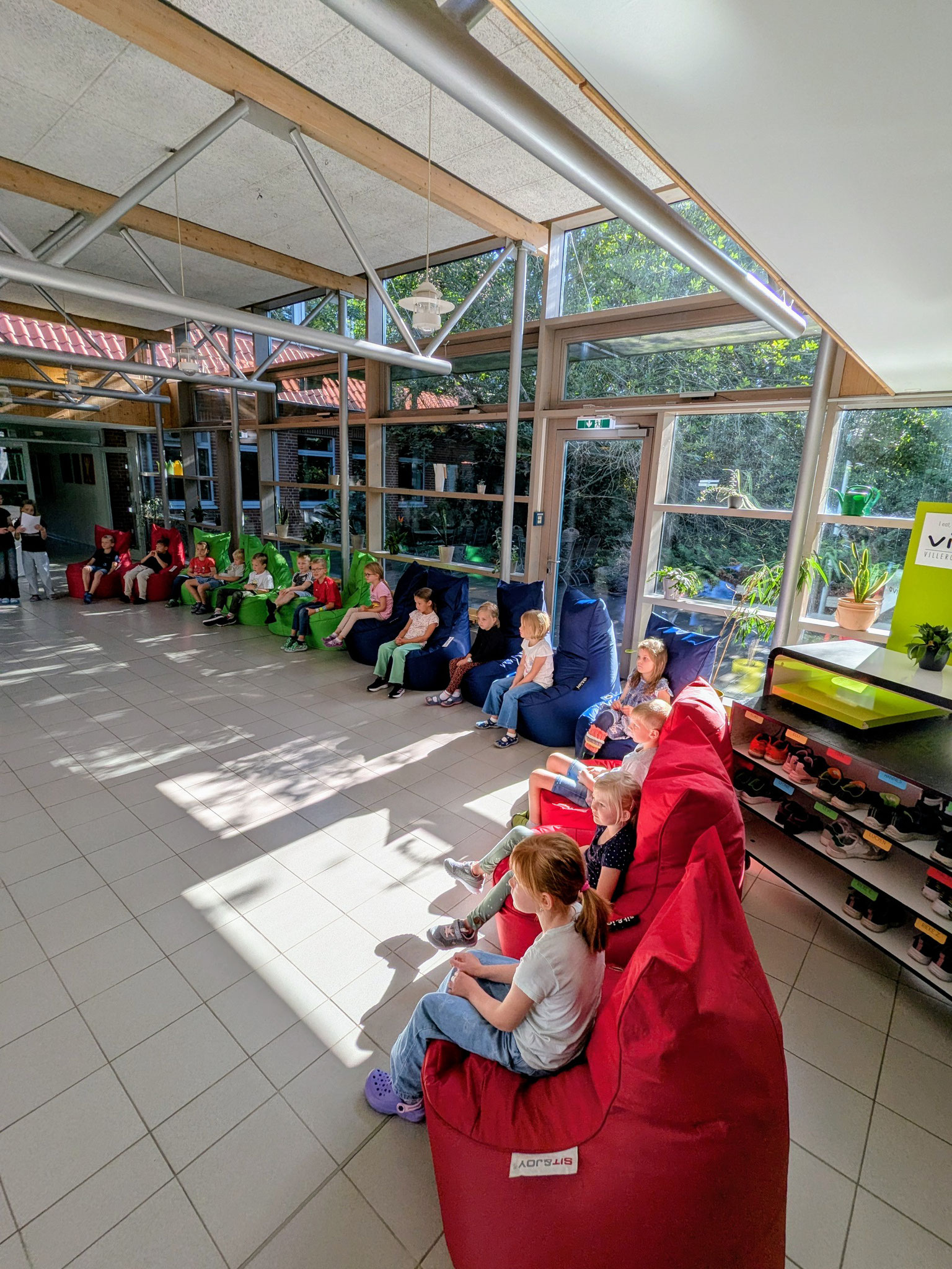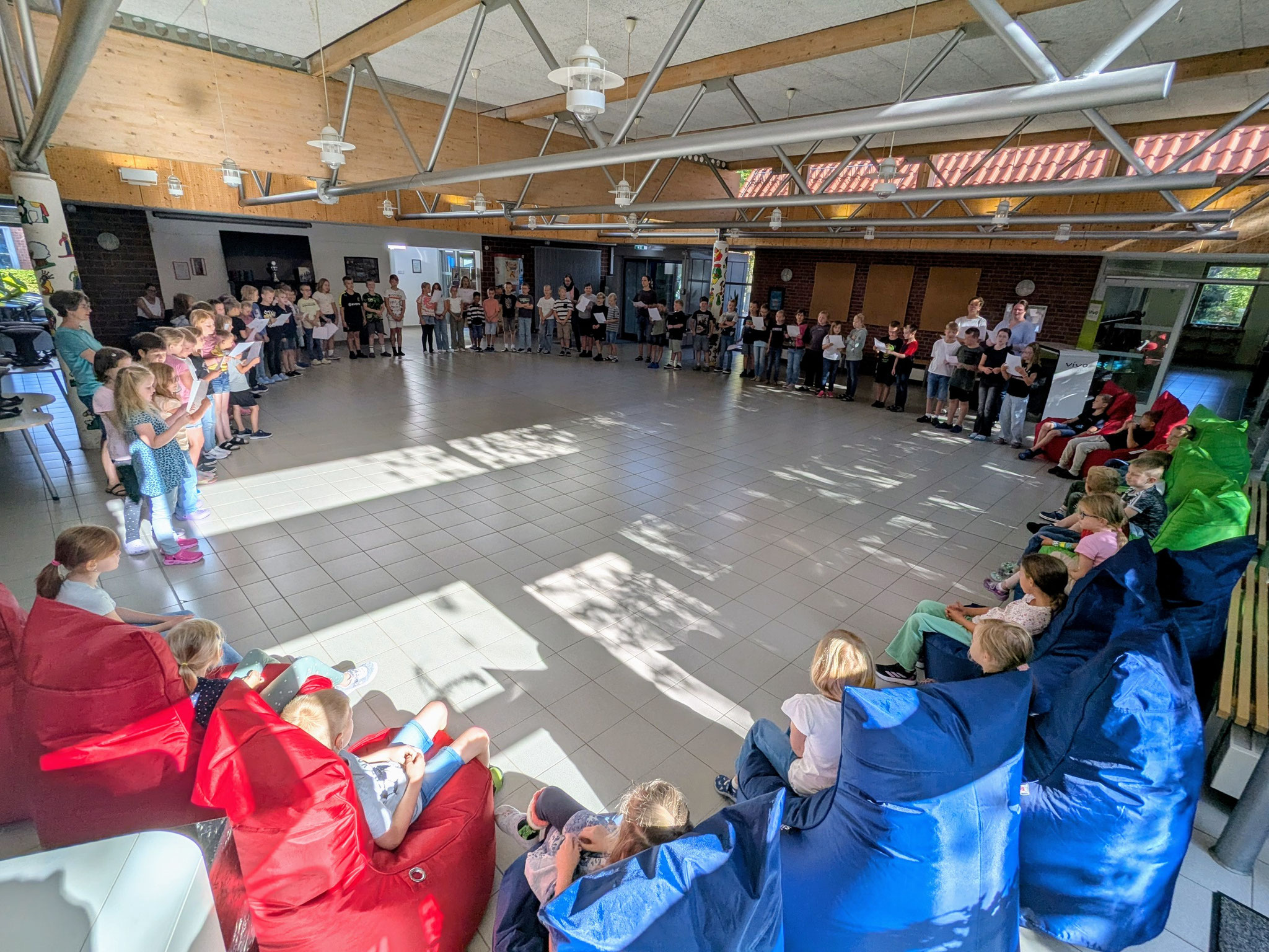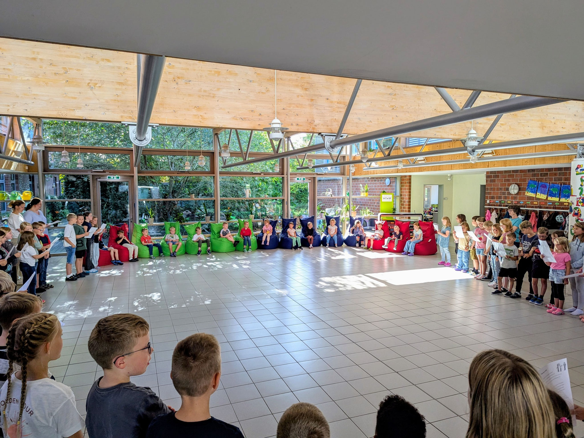 In großer Runde wurden die neuen Erstklässler an ihrem ersten Schultag von allen Klassen aufgenommen und mit einem Lied begrüßt! Danach durfte sich jede/r Erstklässler/in ein Patenkind aus Klasse 3 aussuchen.